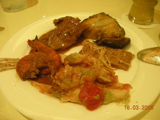 What we eat for our dinner?? THIS!!! The prawn was very delicious. Half cooked i think. But i don't like the oyster. I ate one and almost keluar balik the oyster. Hubby keep asking me to 'telan' the oyster. He say..don't chew..don't chew..telan saja! hehee So one oyster was enough for me. As for the prawns, ate so many of it. Its very fresh oh..2 -3 pcs definitely not enough! There were other food i ate as well like, curry fish head, curry prawn, lasagne, different type of lauk sotong, chicken, and banyak lagi lah. Forgot already.
